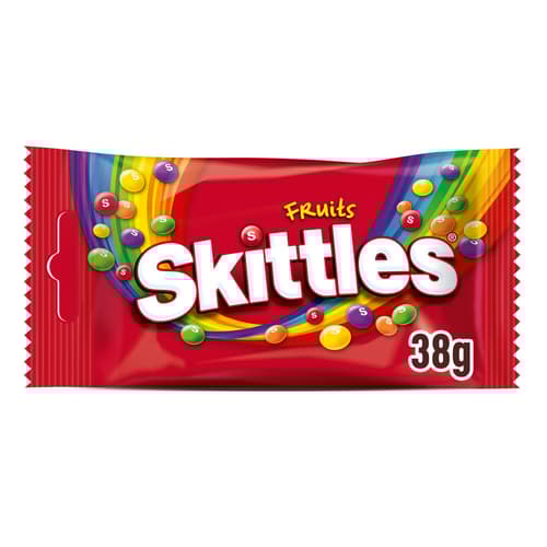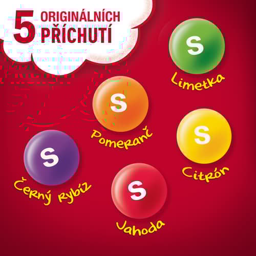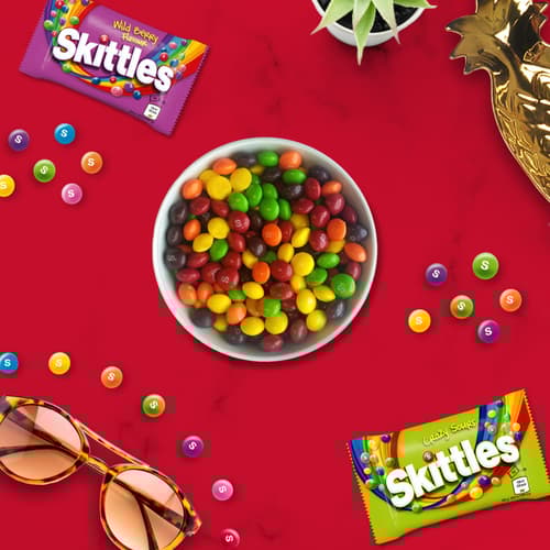 Žvýkací bonbóny Skittles jsou obalené v křupavé cukrové krustě s různými ovocnými příchutěmi – citron, pomeranč, černý rybíz, jahody a limeta .