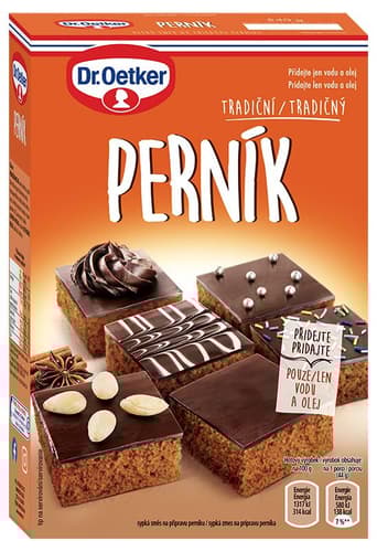 Balení obsahuje: 540 g směsi na přípravu těsta K tomu přidáte: 400 ml vody, 120 ml oleje (12 polévkových lžic) Všechny druhy trub před pečením dobře předehřejte! Elektrická trouba: 165°C 30-40 min. Horkovzdušná trouba: 155°C 30-40 min. Plynová trouba: střední stupeň 30-40 min. Při pečení respektujte zkušenosti s vlastní troubou! 1. Obsah sáčku se směsí na přípravu těsta vysypeme do mísy a přidáme odměřenou vodu a olej. Na zlepšení chuti můžeme přidat 2-3 polévkové lžíce medu. Vše důkladně promícháme vařečkou nebo vyšleháme elektrickým ručním šlehačem dohladka. 2. Těsto vylijeme na vymazaný a moukou vysypaný plech 30 x 40 cm a dáme péct. Čas a teplota pečení jsou uvedené v tabulce.Pokud chceme mít jistotu, že je perník správně upečený, píchneme doprostřed těsta špejli. Pokud se na ni těsto nelepí, perník je hotový. 3. Po vychladnutí můžeme upečený perník potřít džemem, polít tmavou polevou Dr.Oetker a ozdobit podle vlastní fantazie ořechy, kokosem nebo zdobením Dr.Oetker.