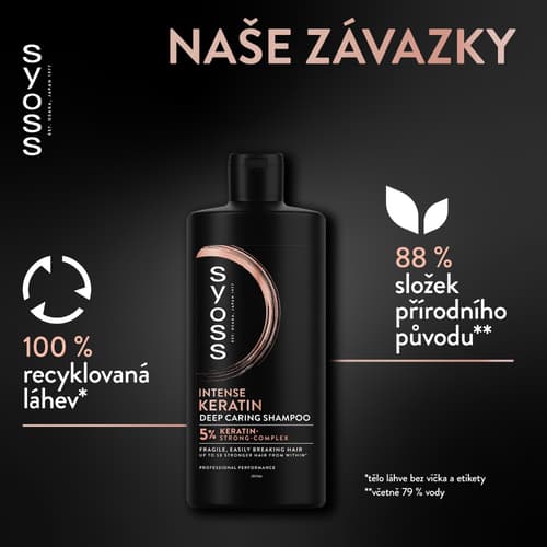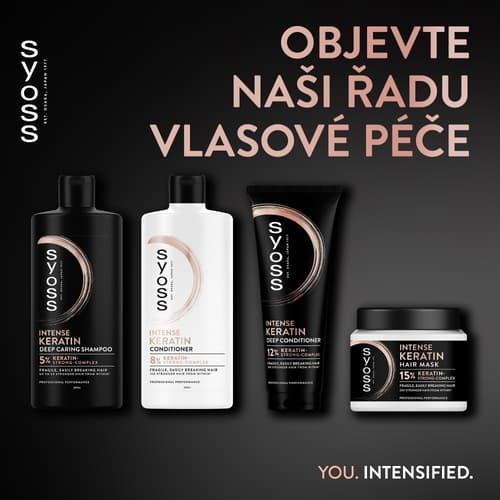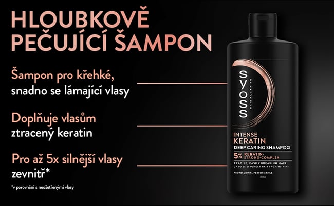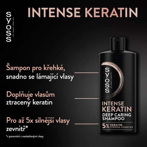 Šampon na vlasy Syoss Intense Keratin je určený pro křehké, snadno se lámající vlasy. Složení s 5% keratinovým posilujícím komplexem zajistí až 5× silnější vlasy zevnitř ve srovnání s neošetřenými vlasy.