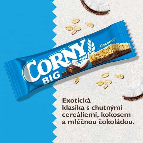 Corny Big je cereální tyčinka s kokosem v mléčné čokoládě, která zažene hlad i chuť na něco sladkého. Obsahuje celozrnné cereální vločky, které z ní dělají ideální svačinku mezi jídly.