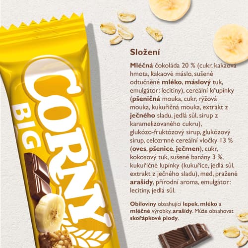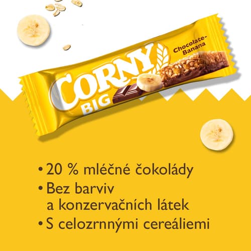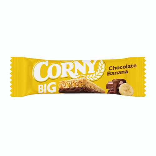 Corny Big je cereální tyčinka s banány v mléčné čokoládě, která zažene hlad i chuť na něco sladkého. Obsahuje směs celozrnných cereálních vloček, které z ní dělají ideální svačinku mezi jídly.