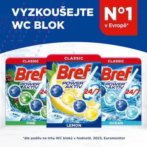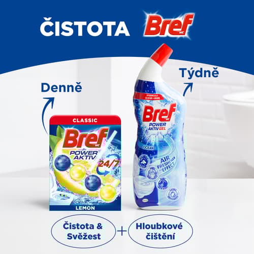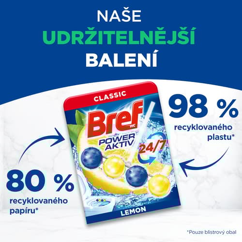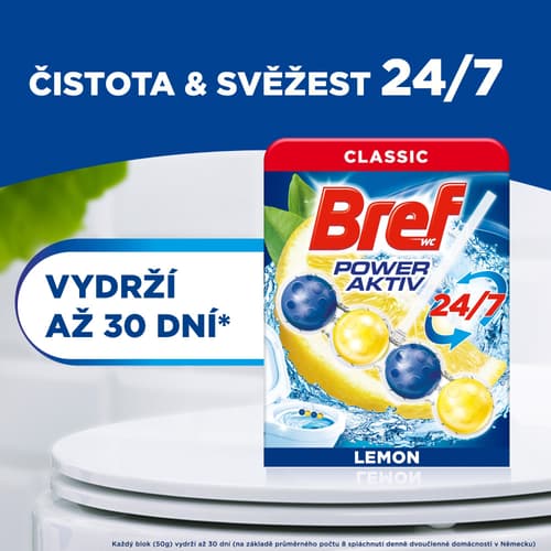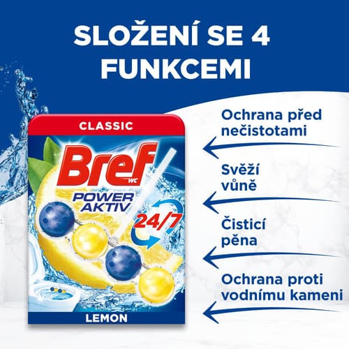 Bref Power Aktiv Lemon je pevný WC blok s vůní citronu v atraktivním balení čtyř kuliček, které v sobě ukrývají recepturu se čtyřmi funkcemi funkcemi.