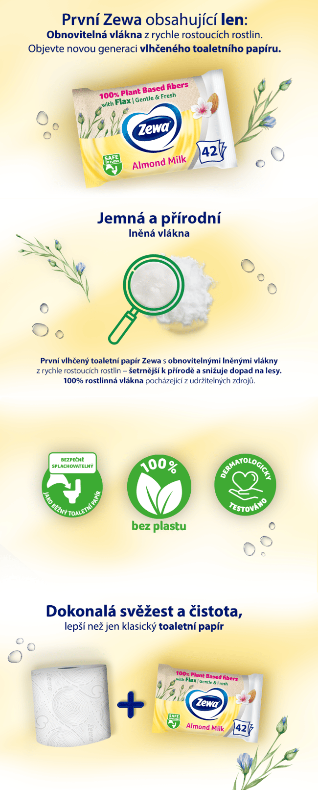 Vlhčený toaletní papír Zewa Almond Milk je příjemně hebký a hýčká pokožku na dotek. Po jeho použití budete mít pocit luxusní čistoty. Splachovatelný a biologicky rozložitelný. Vlhkost, která očistí, ale nezanechá pokožku mokrou.