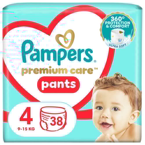 Jednorázové plenkové kalhotky Pampers Premium Care Pants pro děti o hmotnosti 9–15 kg.
