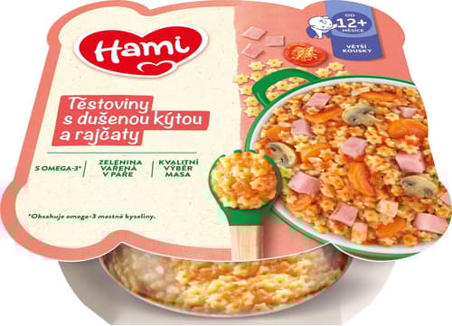 Hami Příkrm těstoviny s dušenou kýtou a rajčaty v praktickém talířku je určen pro vaše nejmenší.