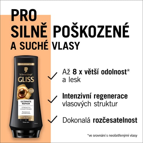 Kondicionér Gliss Ultimate Repair pro silně poškozené vlasy s obsahem keratinu pro hloubkovou regeneraci vlasové struktury.