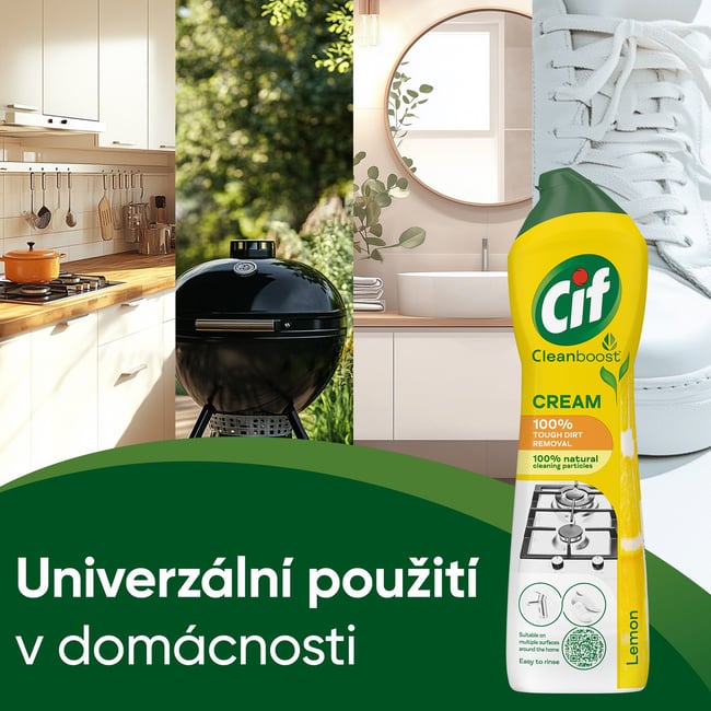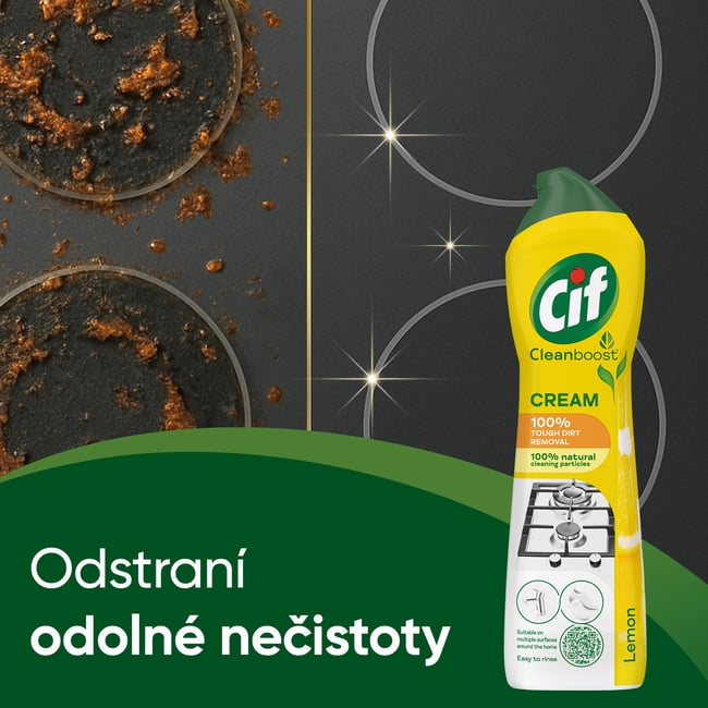 Cif – čistota, na kterou se těšíte. Účinný proti nečistotě a šetrný k vašemu domovu. Cif krém účinně odstraňuje i ty nejodolnější nečistoty, jako je připálený tuk, připálené zbytky jídla, skvrny od vodního kamene, bláto na teniskách nebo špinavé skvrny na stěnách. Zanechává povrchy čisté a lesklé.