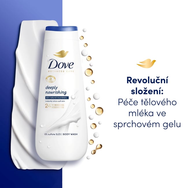 Nová řada sprchových gelů Dove Advanced Care má extra výživné složení pro okamžitě hydratovanou pokožku. Je obohacena o novou patentovanou technologií 24h Renewing MicroMoisture, která rozkládá olejové kapky na miliony mikrokapek pro lepší výživu pokožky.