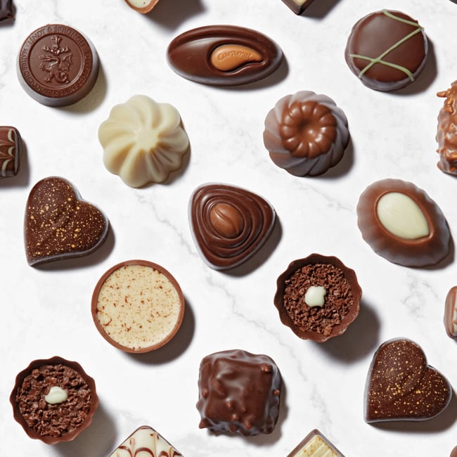 Směs čokoládových bonbónů částečně plněných z hořké a mléčné čokolády.