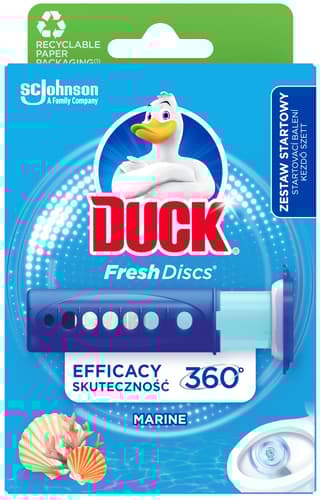 Duck Fresh Discs čistí toaletu, zabraňuje usazování vodního kamene a dlouhodobě ji osvěžuje mořskou vůní. Náplň vydrží až 8 týdnů.