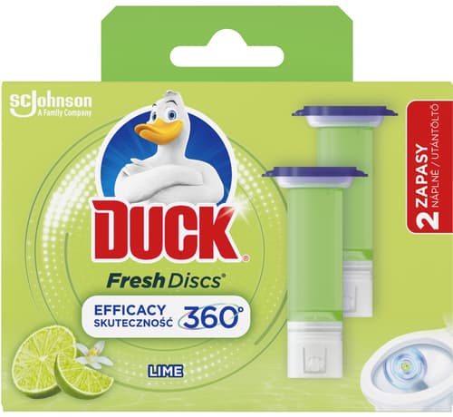 Duck Fresh Discs Duo čistí toaletu s každým spláchnutím, zabraňuje usazování vodního kamene a dlouhodobě ji osvěžuje vůní limetky. Náplň vydrží až 8 týdnů.