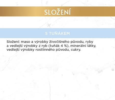 Maso a výrobky živočišného původu, ryby a vedlejší výrobky z ryb (z toho tuňák 4 %), minerální látky, vedlejší výrobky rostlinného původu, cukry