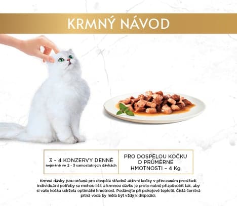Krmný návod: Dospělou kočku o průměrné hmotnosti (4 kg) krmte 4 konzervami denně, nejméně ve 2 samostatných dávkách. Krmné dávky jsou určené pro dospělé středně aktivní kočky v přirozeném prostředí. Individuální potřeby se mohou lišit a krmnou dávku je proto nutné přizpůsobit tak, aby si vaše kočka udržela optimální hmotnost.