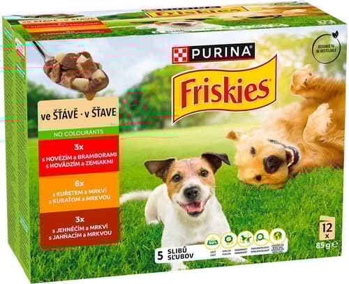 Friskies Adult kapsičky pro psy hovězí, kuře, jehněčí ve šťávě 12×85 g