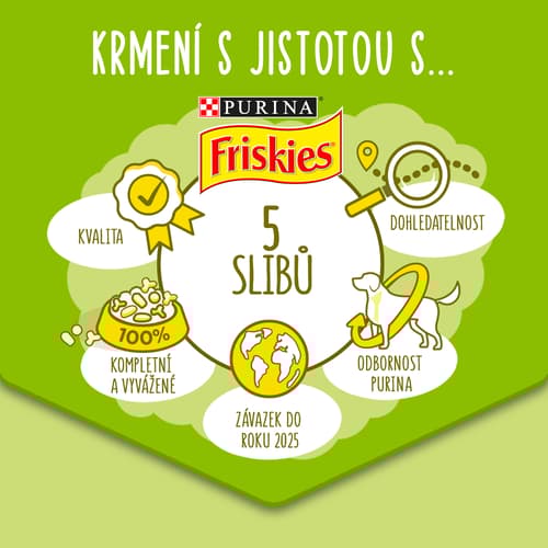 Friskies Adult s kuřetem a hráškem, s hovězím a mrkví, s jehněčím a zelenými fazolkami v želé. Chutná kompletní receptura, která poskytuje vašemu psovi důležité živiny.