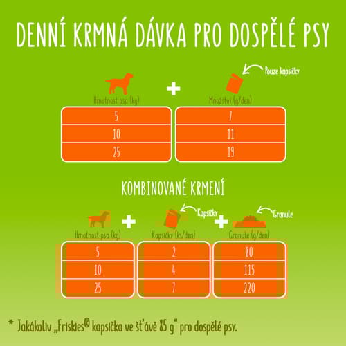 Krmné dávky jsou určené pro dospělé středně aktivní psy v přirozeném prostředí. Individuální potřeby se mohou lišit a krmnou dávku je proto nutné adekvátně přizpůsobit.