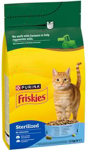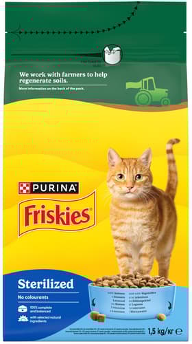 Friskies pro sterilizované a kastrované kočky je 100% kompletní a vyvážená strava speciálně vyvinutá pro potřeby sterilizovaných a kastrovaných koček a pro podporu jejich zdraví.