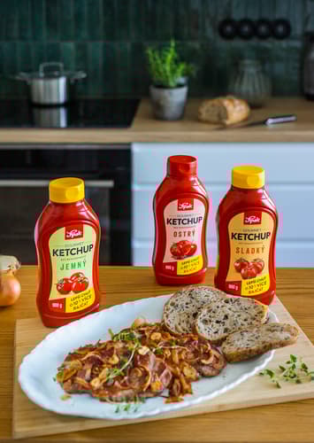 Jemný kečup Spak vyrobený ze ze 100% rajčat z EU zrajících na jižním Slunci.