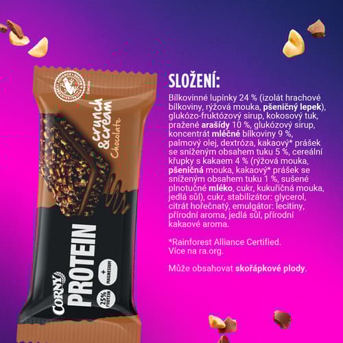 Bílkovinné lupínky 24 % (izolát hrachové bílkoviny, rýžová mouka, pšeničný lepek), glukózo-fruktózový sirup, kokosový tuk, pražené arašídy 10 %, glukózový sirup, koncentrát mléčné bílkoviny 9 %, palmový olej, dextróza, kakaový* prášek se sníženým obsahem tuku 5 %, cereální křupky s kakaem 4 % (rýžová mouka, pšeničná mouka, kakaový* prášek se sníženým obsahem tuku 1 %, sušené plnotučné mléko, cukr, kukuřičná mouka, jedlá sůl), cukr, stabilizátor: glycerol, citrát hořečnatý, emulgátor: lecitiny, přírodní aroma, jedlá sůl, přírodní kakaové aroma. *Rainforest Alliance Certified. Více na ra.org.