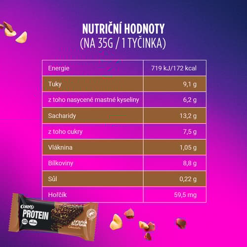 Čokoládová, proteinová, cereální tyčinka s křupinkami a krémovou náplní s obsahem proteinu a hořčíku. Zdroj bílkovin zejména před nebo po cvičení.