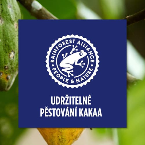 - čokoláda je vyrobena ze 100% udržitelně získaných kakaových bobů certifikovaných aliancí Rainforest