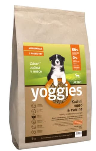Granule vhodné pro štěně – I když jsou všechna krmiva Yoggies vhodná pro dospělé psy i štěňata ("All Life Stages"), granule Yoggies Active se doporučují jako první volba, pokud hledáte granule pro štěně středních a velkých plemen. Důvodem je vyšší obsah proteinů, tuků a vloček z hnědé loupané rýže a brambor, tedy energie pro každý den.