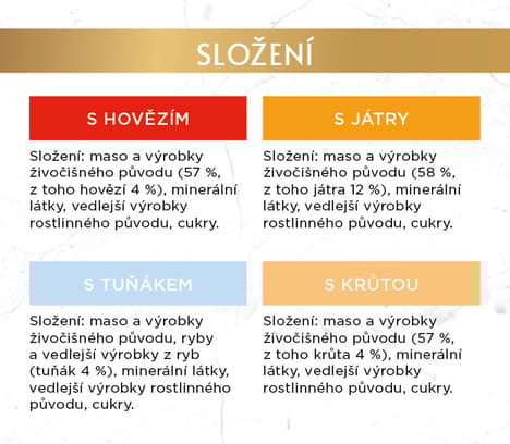 S HOVĚZÍM: Maso a vedlejší výrobky živočišného původu (z toho hovězí 4 %), vedlejší výrobky rostlinného původu, minerální látky, cukry
