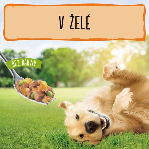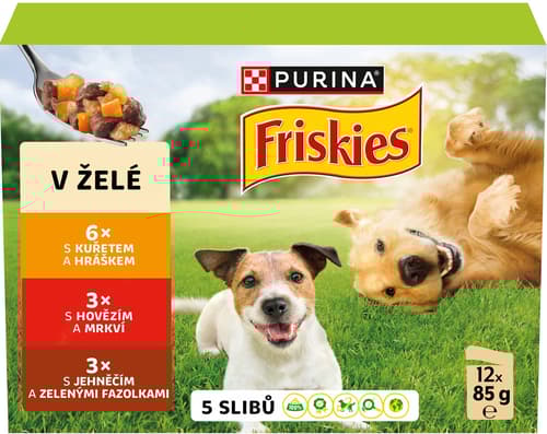 Friskies Adult s hovězím a mrkví, kuřetem a hráškem a jehněčím se zelenými fazolkami. Chutná kompletní receptura, která poskytuje vašemu psovi důležité živiny.