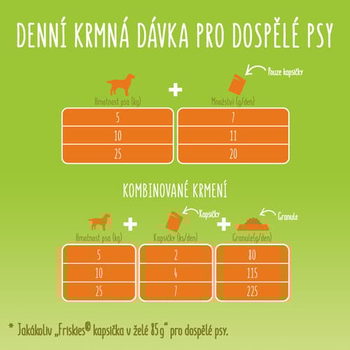 Krmné dávky jsou určené pro dospělé středně aktivní psy v přirozeném prostředí. Individuální potřeby se mohou lišit a krmnou dávku je proto nutné adekvátně přizpůsobit. Čistá čerstvá pitná voda by měla být vždy k dispozici.