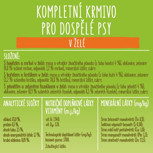 S kuřetem a hráškem v želé: maso a výrobky živočišného původu (z toho kuře 4 %), obiloviny, zeleniny (1,2 % dehydrovaného hrášku, odpovídá 10,8 % hrášku), minerální látky, cukry.
