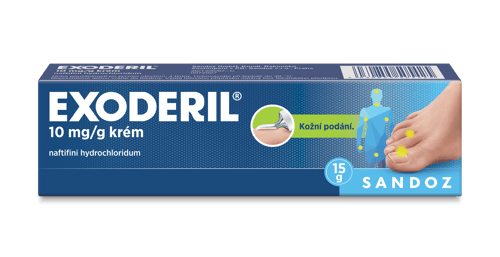 Exoderil® krém je účinný lék na plíseň kůže a nehtů. Rychle uleví od svědění, potlačí zarudnutí a působí také antibakteriálně. Aplikace jen 1x denně na kůži. Exoderil® krém je účinný antimykotický přípravek na léčbu kožní a nehtové plísně na celém těle. Stačí aplikovat pouze 1x denně na plíseň kůže. Používá se k léčbě mykóz kůže, kožních záhybů, nehtů, meziprstí, kandidových onemocnění kůže (opruzeniny infikované kvasinkou), k léčbě pytiriasis versicolor a zánětlivých kožních plísňových onemocnění (se svěděním i bez svědění). Je vhodný pro dospělé i děti. Díky účinné látce naftifin hubí nebo zastavuje množení původců plísní a léčí plísňová onemocnění. Rychle uleví od svědění, potlačí zarudnutí a působí také antibakteriálně proti některým bakteriím, které mohou vyvolat druhotnou infekci. Exoderil® krém se velice dobře nanáší a roztírá, rychle se vstřebává. Stačí aplikovat pouze 1x denně na kůži* Expert na plísně – účinný proti svědění, zarudnutí a některým bakteriím Ničí původce mykotického onemocnění a zabraňuje jejich dalšímu šíření Vhodný pro celou rodinu – bez věkového omezení * Při postižení nehtů 2x denně Exoderil® s TROJÍM ÚČINKEM Už jste unaveni z toho, jak vám plíseň znepříjemňuje život? Používejte proti plísním Exoderil® s trojím účinkem! PROTI PLÍSNÍM A KVASINKÁM Exoderil® je účinné antimykotikum, které hubí původce plísní a kvasinky. PROTI ZÁNĚTU Exoderil® proniká do vrstev kůže a rychle ulevuje od příznaků zánětu jako je svědění. PROTI BAKTERIÁLNÍ INFEKCI Exoderil® působí také proti některým bakteriím způsobujícím druhotnou infekci. Běžné příznaky mykóz: Mykózy kůže se obvykle projevují zčervenáním, svěděním, někdy i olupováním kůže s nepříjemným zápachem, případně bolestivými prasklinkami kůže. Mykóza nehtů (uvnitř nebo pod nehtem) se pozná podle změny tvaru, barvy a struktury nehtu. Nehet zesílí, ztratí lesk a zkroutí se. Infekce se může rozšířit i na okolní nehty a kůži. V tomto případě doporučujeme používat přípravek ve formě roztoku. Kde nás mohou trápit plísně? Mykózy pokožky či nehtů nás mohou potkat celoročně. Vyskytují se především v místech zvýšeného výskytu vlhkosti. Ať už se projevují nepříjemným svěděním, zarudnutím, či změnami struktury a/nebo barvy nehtu, je třeba proti nim včas zasáhnout. Jaké jsou nejčastější příčiny vzniku a šíření lokálních mykóz? Balení obsahuje 15g krému.