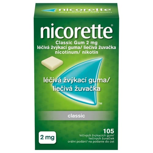 Nicorette Classic Gum 2 mg s jemnou neutrální příchutí ti pomůže při odvykání kouření. Díky rychlému nástupu účinku zmírňuje chuť na cigaretu a abstinenční příznaky. Neobsahuje cukr. Balení obsahuje 105 kusů. Pomůže ti zbavit se závislosti na cigaretách jednou provždy! Tato žvýkačka pro odvykání kouření je vyrobena speciální recepturou, která uvolňuje malou terapeutickou dávku nikotinu. Tělo jej pomalu vstřebává, což ti pomůže aktivně bojovat proti sedmi abstinenčním příznakům odvykání, kterými jsou: chuť na cigaretu, úzkost, podrážděnost, špatná nálada, neklid, špatná koncentrace a zvýšená chuť k jídlu Hlavní benefity zmírňuje chuť na cigaretu, pomáhá zvládnout abstinenční příznaky rychlý nástup účinku dovoluje postupné snižování dodávané dávky nikotinu neobsahuje cukr