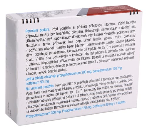 Valetol tablety jsou spolehlivým pomocníkem pro rychlou úlevu od bolesti. Tato kombinace propyfenazonu, paracetamolu a kofeinu účinně tlumí bolest a snižuje horečku. Jsou ideální pro dospělé a dospívající od 15 let na bolesti hlavy, zubů, zad, po operacích, při nachlazení nebo menstruační bolesti. Účinek nastupuje už do půl hodiny. Balení obsahuje 24 tablet.