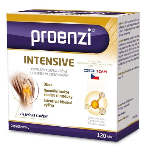Doplněk stravy. Walmark Proenzi Intensive je doplněk stravy, který obsahuje výtažky z tradičně používané vrby bílé (Salix alba), kurkumy dlouhé (Curcuma longa), extrakt Boswellia serrata, vitamín C, mangan, kolagen typu II, glukosamin sulfát, chondroitin sulfát a patentovaný BioPerine (extrakt z pepřovníku černého), což je podpůrná složka přírodního původu, která zlepšuje vstřebávání některých minerálů, vitamínů a dalších látek až o 80 %. Vrba bílá, kurkuma dlouhá a Boswellia serrata přispívají normálnímu stavu kloubů. Vitamin C přispívá ke správné tvorbě kolagenu pro normální funkci kostí a chrupavek. Mangan napomáhá normální tvorbě pojivových tkání. Přípravek není vhodný pro děti do 12 let, těhotné a kojící ženy. Osoby užívající léky na snížení srážlivosti krve by měly užívání přípravku konzultovat se svým lékařem. Nepřekračujte doporučené denní dávkování. Uchovávejte mimo dosah dětí. Doplňky stravy nejsou náhradou pestré stravy. Balení: 120 tablet.