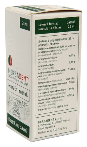 Stáhnout příbalový letákLéčivé látky herbarum extractum fluidum pro Herbadent (bylinný extrakt pro přípravek Herbadent) 22,5ml, acidum salicylicum (kyselina salicylová) 0,25g, benzocainum (benzokain) 0,0625g. Pomocné látky: kyselina boritá, monohydrát kyseliny citronové, silice máty peprné, silice hřebíčkovcového květu, silice plodu fenyklu obecného pravého. Složení extraktu: Agrimoniae herba (řepíková nať) 5,0 g Matricariae flos (heřmánkový květ) 2,0 g Salviae officinalis herba (nať šalvěje lékařské) 2,0 g Tormentillae rhizoma (nátržníkový oddenek) 1,0 g Ethanolum 96% (V/V) (ethanol 96%) 77,0 g Aqua purificata (čištěná voda) 18,5 g