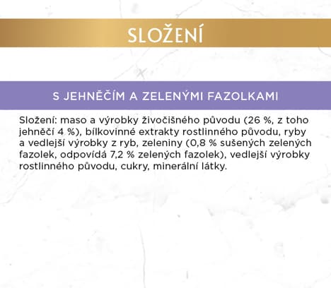 Maso a výrobky živočišného původu (z toho jehněčí 4 %), bílkovinné extrakty rostlinného původu, ryby a vedlejší výrobky z ryb, vedlejší výrobky rostlinného původu, zeleniny (0,8 % dehydrovaných zelených fazolek, odpovídá 7,2 % zelených fazolek), minerální látky, cukry