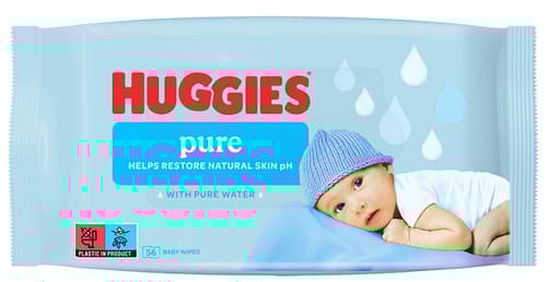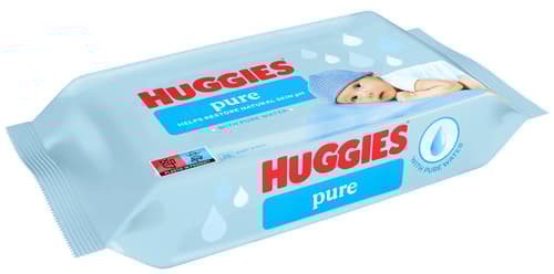Hypoalergenní dětské vlhčené ubrousky Huggies Pure Single bez parfemace určené pro novorozence a děti s citlivou pokožkou.