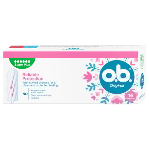 Všechny tampony o.b.® jsou bez přidaných chemických škodlivin**, nebělené chlorem, neparfemované a gynekologicky testované.