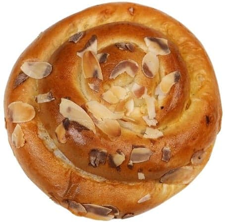 Mouka PŠENIČNÁ hladká světlá/t530, voda pitná, cukr, Forte S rostlinný tuk (nehydrogenované oleje a tuky 80 % /tuk palmový, olej řepkový, voda, emulgátor (mono - a diglyceridy mastných kyselin E 471, E 322), sůl jedlá, regulátor kyselosti: kyselina citronová E 330, konzervant: sorban draselný E 202, přírodní barvivo: annato E 160b, látky určené k aromatizaci), VAJEČNÁ melanž pekařská (pasterovaná VAJEČNÁ melanž, sůl jedlá, kyselina E 260, regulátory kyselosti: E 270, E 325), droždí pekařské čerstvé, lupínky MANDLOVÉ 0,8 %, sůl jedlá kamenná, zlepšující přípravek (PŠENIČNÁ mouka, cukr, emulgátor E 472e, dextróza, sůl jedlá, SÓJOVÁ mouka, regulátor kyselosti: kyselina citrónová, enzymy, látka zlepšující mouku: kyselina askorbová).
