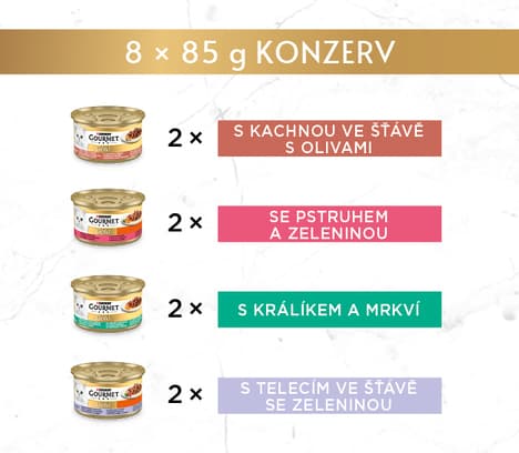 Gourmet Gold konzervy pro kočky kachna, pstruh, králík, telecí ve šťávě 8×85 g