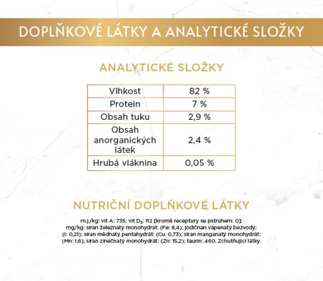 Se pstruhem a zeleninou: maso a výrobky živočišného původu, obiloviny, ryby a vedlejší výrobky z ryb (z toho pstruh 4 %), minerální látky, zeleniny (0,45 % dehydrované zeleniny, odpovídá 4 % zeleniny), cukry