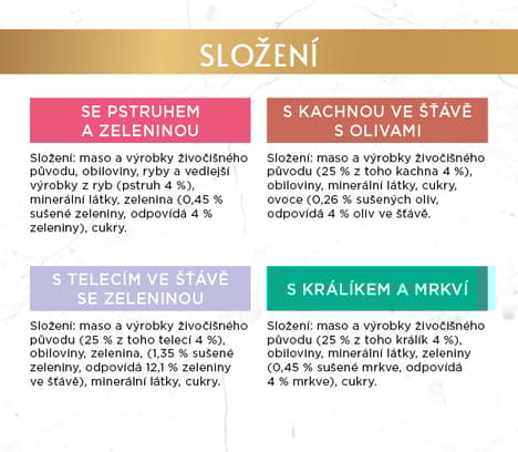 S kachnou ve šťávě s olivami: maso a výrobky živočišného původu (z toho kachna 4 %), obiloviny, minerální látky, cukry, ovoce (0,25 % dehydrovaných oliv, odpovídá 4 % oliv ve šťávě)