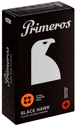 Primeros Black Hawk černé kondomy s rozšířeným anatomickým tvarem a svěží vůní, 12 kusů