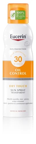 Eucerin Transparentní sprej na opalování Dry Touch SPF 30 je transparentní sprej na opalování vyvinutý speciálně pro citlivou pokožku těla. Poskytuje účinnou a spolehlivou ochranu proti slunečnímu poškození prostřednictvím systému širokospektrálních a fotostabilních UVA/UVB filtrů. Složení splňuje standardy Cosmetics Europe, Asociace osobní péče (dříve Colipa). UVA a UVB záření může vyvolávat poškození buněk v hlubších vrstvách epidermis. Eucerin Transparentní sprej na opalování Dry Touch SPF 30 podporuje biologickou ochranu buněk, a tak pomáhá chránit kožní buňky zevnitř proti slunečnímu poškození. Složení bylo vyvinuto speciálně pro pokožku těla a ve formě aerosolového spreje umožňuje rychlé a nepřetržité rozprašování z mnoha úhlů. Usnadňuje tak aplikaci i na obtížně dosažitelné partie těla. Eucerin Transparentní sprej na opalování Dry Touch SPF 30 má ultra lehkou, transparentní konzistenci, která se rychle vstřebává a nabízí osvěžující účinek. Je voděodolný, nemastný a nelepivý.