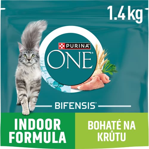 Purina One Indoor s recepturou Bifensis® je krmivo speciálně navržené pro kočky žijící převážně v bytě. Jeho složení s krůtou bylo vyvinuto veterináři a experty na výživu tak, aby poskytovalo vaší kočce všechny nezbytné živiny, které potřebuje v každém jídle, zároveň bere ohled na snížený energetický výdej a pomáhá redukovat tvorbu smotků chlupů.