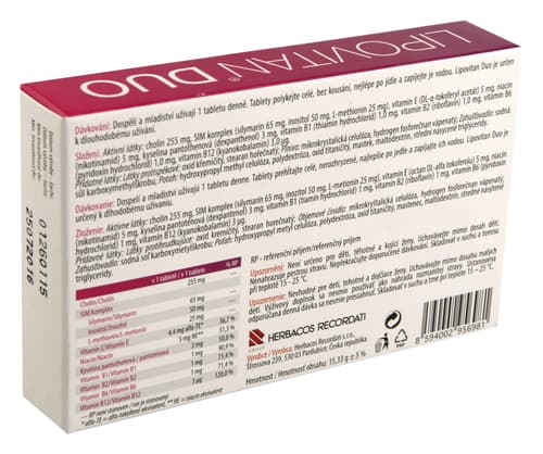 Doplněk stravy. Lipovitan Duo obsahuje cholin, SIM Komplex (silymarin, inositol, metionin) a vitaminy. Cholin přispívá k udržení normální činnosti jater a přispívá k normálnímu metabolismu lipidů. Silymarin přispívá k ochraně jater hlavně před nepříznivými účinky některých škodlivin, jako jsou alkohol, průmyslové jedy i některé chemické látky včetně léků. Lipovitan Duo je určený k dlouhodobému užívání. Není určeno pro děti, těhotné a kojící ženy. Nepřekračujte doporučené denní dávkování. Uchovávejte mimo dosah dětí. Doplňky stravy nejsou náhradou pestré stravy. Balení: 30 tablet.