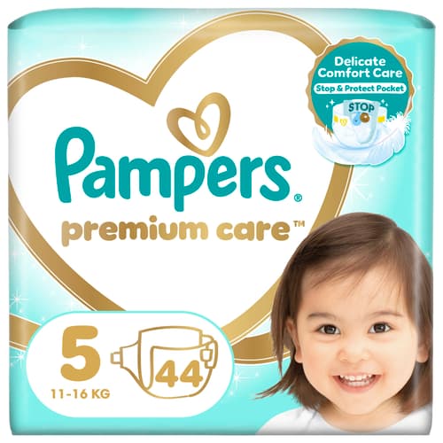 Jednorázové plenky Pampers Premium Care s hebkou povrchovou vrstvou pro děti o hmotnosti 11–16 kg.
