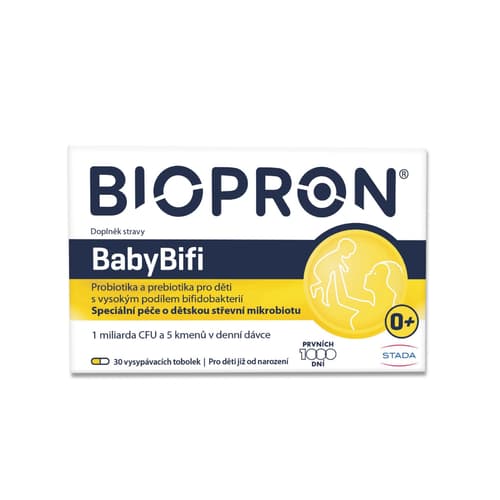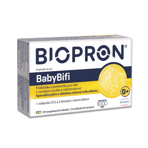 Doplněk stravy. Probiotikum s vysokým podílem bifidobakterií. - 1 miliarda aktivních bakterií v denní dávce. - vhodný již od narození tobolky. - jejichž obsah lze vysypat. Probiotický komplex Biopron LAKTOBACILY Baby BIFI představuje vyváženou kombinaci probiotických kultur obohacenou o prebiotika fruktooligosacharidy (FOS). Jeho speciální složení je přizpůsobené dětské střevní mikroflóře. Obsahuje 3 kmeny bifidobakterií v kombinaci s laktobacily, obsah probiotických kmenů je doplněn prebiotickými fruktooligosacharidy. Hlavní podíl obsažených probiotik tvoří bifidobakterie, které jsou vhodné zejména pro dětský organismus. Bifidobakterie jsou první mikroorganismy, které osídlují trávicí trakt dítěte. Biopron LAKTOBACILY Baby BIFI je obzvlášť vhodný nejen v průběhu, ale i po užívání antibiotik. Přípravek je určený dětem od narození. Nepřekračujte doporučené denní dávkování. Uchovávejte mimo dosah dětí. Doplňky stravy nejsou náhradou pestré stravy. Baleníobsahuje 30 tobolek. Hmotnost obsahu: 6,9 g.