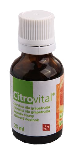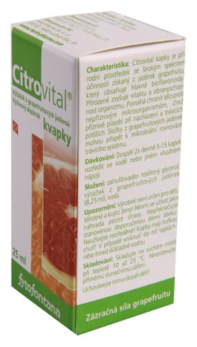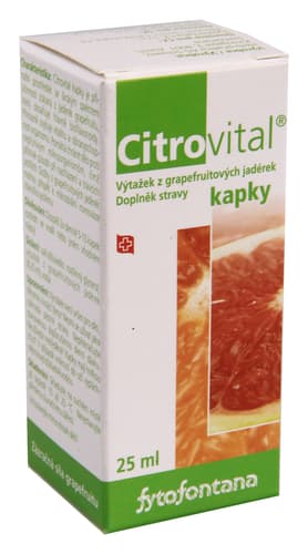 Doplněk stravy. Citrovital kapky obsahují výtažek z grapefruitových jadérek, které jsou bohaté na přírodní polyfenoly a mají i antioxidační účinky. Antioxidanty přispívají k potlačení škodlivých oxidačních procesů v našem organismu. Nepřekračujte doporučené denní dávkování. Uchovávejte mimo dosah dětí. Doplňky stravy nejsou náhradou pestré stravy. Výrobek není určen pro děti, těhotné a kojící ženy. Balení: 25ml.