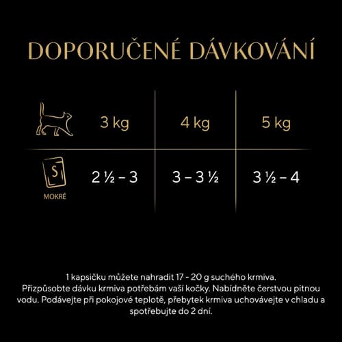 Kočka o hmotnosti 3 kg potřebuje 2½–3 kapsičky denně, kočka o hmotnosti 4 kg potřebuje 3–3½ kapsičky denně, kočka o hmotnosti 5 kg potřebuje 3½–4 kapsičky denně. Jednu kapsičku můžete nahradit 17–20 g suchého krmiva. Úhrn kalorií se počítá z pochoutek. Přizpůsobte dávku krmiva potřebám vašeho kotěte. Nabídněte čerstvou pitnou vodu. Podávejte při pokojové teplotě, přebytek krmiva uchovávejte v chladu a spotřebujte do dvou dní.